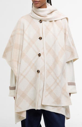 Knit from a rich wool blend for warmth and texture, this cardigan-style cape features open sides and an attached scarf. It's styled with a refined tartan pattern in a neutral palette.