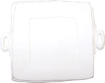 Made from Italian stoneware, the uneven edges and rustic feel of this square platter are inspired by an overlapping wooden mold used to for centuries to form cheese.