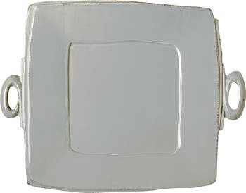 Made from Italian stoneware, the uneven edges and rustic feel of this square platter are inspired by an overlapping wooden mold used to for centuries to form cheese.