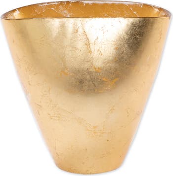 Elevate your table with this elegant glass vase coated in rustic, shimmering gold leaf.
