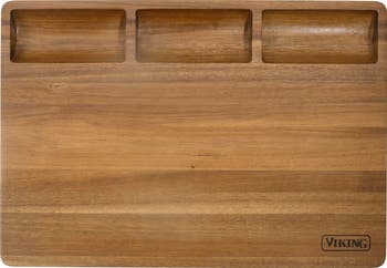 This wood board reverses from a flat cutting surface to a side with three indents—measuring one cup each—that can store chopped veggies and ingredients.