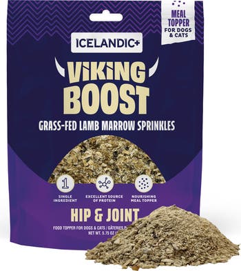 VIKING BOOST: LAMB MARROW FOOD TOPPER - Unleash the bold spirit of Iceland with Viking Boost, a nutrient-rich, single-ingredient food topper made from 100% free-range Icelandic lamb marrow. Crafted to naturally elevate your pet’s daily meals, these savory sprinkles are packed with glucosamine, collagen, and other beneficial nutrients that help support healthy joints, mobility, and overall vitality. The rich, mouthwatering flavor makes mealtime more exciting—perfect for enticing picky eaters or simply adding wholesome variety to your pet’s routine. With no grains, fillers, additives, preservatives, or artificial ingredients, this topper reflects a clean, natural approach to nutrition while delivering the protein and nourishment your pet deserves. Just sprinkle it over your pet’s favorite food to enhance flavor, texture, and nutritional value, turning everyday meals into feasts worthy of a Viking warrior. Whether used daily or as a special boost, it provides a dependable, natural way to support your pet’s long-term health. SUGGESTED FEEDING: Dogs — 1 tsp per ½ cup of food; Cats — 0.5 tsp per ¼ cup of food.