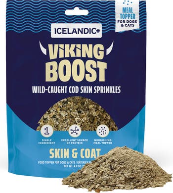 VIKING BOOST: COD SKIN FOOD TOPPER - Unleash the bold spirit of Iceland with Viking Boost, a nutrient-rich, single-ingredient food topper made from 100% wild-caught cod skin. Crafted to elevate your pet’s daily meals, these flavorful sprinkles are air-dried to preserve their natural goodness, delivering a powerhouse blend of omega-3 fatty acids, collagen, and quality protein. This mighty trio helps support healthy skin, promote a shiny, lustrous coat, and nourish overall wellness from the inside out. Perfect for picky eaters, Viking Boost adds a crave-worthy aroma and taste pets love, making mealtime more exciting and satisfying without unnecessary additives or fillers. Easily sprinkle it over your pet’s favorite food to enhance flavor, texture, and nutrition—transforming ordinary meals into feasts worthy of a Viking warrior. Whether used daily or as an occasional boost, this topper provides wholesome benefits that align with a natural, simple ingredient philosophy. SUGGESTED FEEDING: Dogs — 1 tsp per ½ cup of food; Cats — 0.5 tsp per ¼ cup of food.
