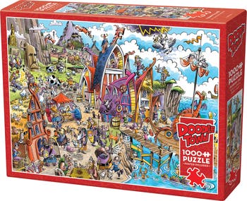 The Viking Village just received a new shipment of chaos. Come have fun exploring the island, playing chess, having tea parties with the wildlife, swimming with the sea monster, fend off some dragons, drink ale, fly away on Pegasus and whatever other ridiculous thing you can think of that Vikings do...but do they really? They do in Doodletown. Join the excitement and have some laughs along the way. This 1,000 piece DoodleTown puzzles are full of hidden images, whimsical characters, and humorous vignettes. Illustrated by Canadian artist David Whamond. Cobble Hill Doodle Town Puzzles are manufactured in the United States using the finest inks, premium grade blue board, linen paper, and the most endearing images. Our puzzles feature interesting random-shaped pieces - which are a departure from the more traditional predictable pieces found in most puzzles. No two pieces are alike. We also include a handy poster, making it easier for multiple people to work on the puzzle at the same time. We use quality linen print paper that gives the puzzle a luxurious look and feel. Not only does it look elegant, but it also works to reduce the glare by dispersing the light across the cross hatches much better than a smooth paper finish. We're environmentally friendly in that we use vegetable-based inks, and the cardboard is made from recycled material. Puzzles are sealed in shrink wrap. The box is thick and sturdy, so it can stand the test of time. The Cobble Hill Puzzle Company was founded in 2005 with a desire to bring quality puzzles with a loving, whimsical, and nostalgic feel to jigsaw puzzle enthusiasts and novices. Made in the USA.