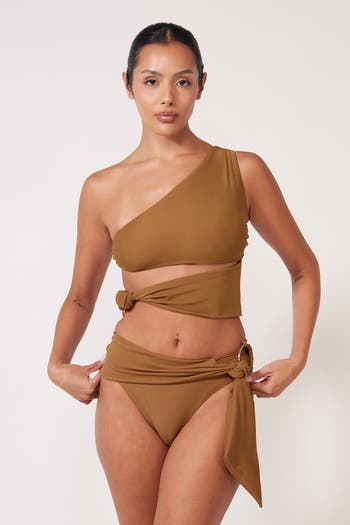 The Remy Top features a one-shoulder silhouette anchored by an asymmetrical cutout, oversized knot, and silver O-ring detail. Minimalist design with maximum presence.