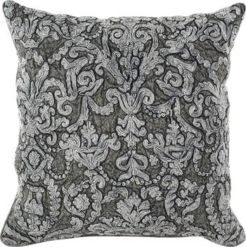 A heavily embroidered pattern on stonewashed linen details an accent pillow that offers a fresh take on traditional elegance.