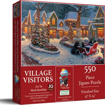 Step into a charming winter wonderland with the "Village Visitors" 550 piece jigsaw puzzle. Renowned artist Mark Keathley expertly etches a festive village scene, perfect for inviting holiday cheer into your home. This 15" x 24" masterpiece, crafted from high-quality recycled cardboard, boasts perfectly interlocking pieces for a frustration-free fit that enhances the puzzle-making experience. SunsOut Puzzles, a remarkable woman-owned small business, proudly manufactures this puzzle in the USA, ensuring a product that's as eco-friendly as it is engaging, utilizing soy-based inks and superior recycled-board materials. Not only an enthralling pastime, this puzzle is also a perfect holiday gift, offering a delightful challenge and a heartwarming escape. The idyllic depiction of a festive village scene crafts an intimate and magical atmosphere, ideal for quiet evenings or lively gatherings. Indulge in the artistic beauty of the fully licensed artwork that captures the very essence of Americana Christmas. With a worry-free guarantee and exceptional customer service handling any concerns about missing or damaged pieces, SunsOut Puzzles embodies their commitment to quality and local craftsmanship. Add the nostalgic charm of this jigsaw puzzle to your home this holiday season, as you bring the enchanting winter scene to life piece by piece.