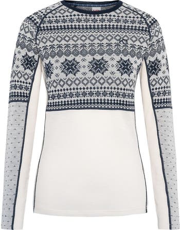 We live for crisp mornings and snowy trails, and the Kari Traa Vilma Long-Sleeve Baselayer keeps us warm through it all. Crafted from 100% merino wool, it delivers natural insulation that retains heat even when dampideal for high-output days or long layering sessions under shells. The jacquard-knit pattern nods to soft falling snow, while underarm panels and raglan sleeves ensure a full range of motion. Smooth flatlock seams prevent chafing for all-day comfort, and the round neckline offers a flattering, classic fit. Ethically made with traceable, non-mulesed wool, the Vilma combines premium quality with timeless mountain-ready style.