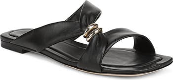 Polished hardware highlights the strappy, asymmetric silhouette of this outfit-elevating sandal.