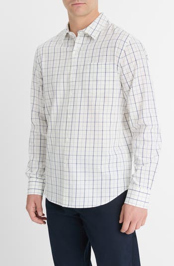 A neat windowpane plaid adds a refined touch to this button-up shirt cut from breathable cotton enhanced with a touch of wool for added heft as the season starts to cool.