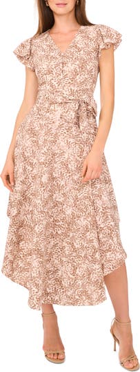 Subtle shades gently pattern a summery dress fixed with flouncy sleeves and cinched with a simple sash.