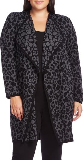 A cheetah motif adds a hint of exotic flair to an open-front cardigan with a gracefully draped front.
