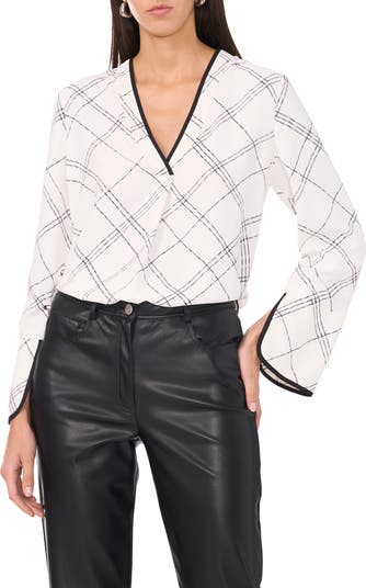 A graceful grid animates a gently flowy top traced in contrast color and served with slit sleeve cuffs.