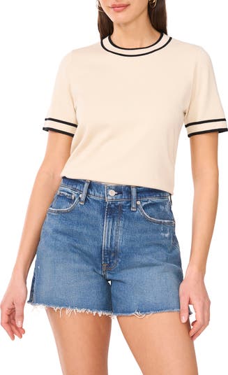 Sporty contrast-stripe trim frames a short-sleeve sweater knit from lightweight yarns for a season-spanning look you'll love.