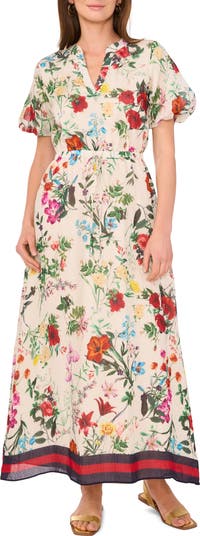 Bring the garden to the party in this puff-sleeve maxi dress framed by a split neck and elastic waist with dainty ties.