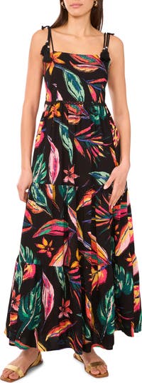A black background showcases the bright blooms animating a lightweight maxi dress that positively must come along on your next vacation. Tassel-tied straps complete the look.