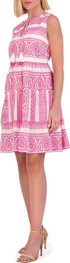 Intricate, colorful jacquard and tassels off the neckline lend boho charm to a warm-weather dress made entirely from cotton.