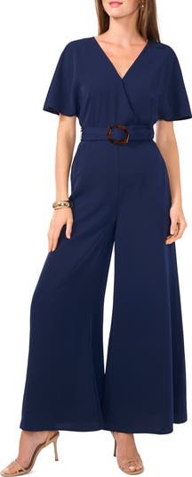 Get to the fun faster in a one-and-done jumpsuit designed with superwide legs balanced by the cinch of a matched belt.
