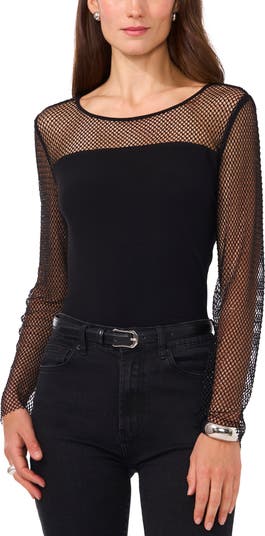 Perfect your going-out looks with this alluring crepe top showcasing a sheer fishnet yoke and long sleeves covered in dazzling rhinestones.