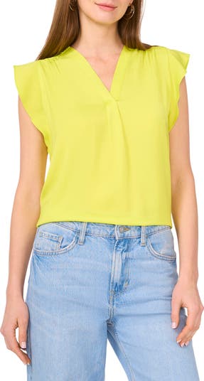 Soft ruffles flutter at the shoulders of this smooth satin top designed with a dipped neckline.
