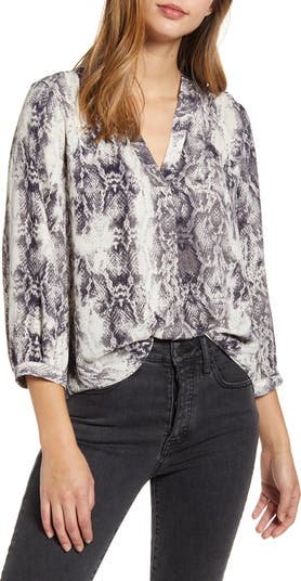 Contemporary, fun blouse with a trendy but not obnoxious snake pattern. The color tones run to a warm grey, making this blouse look super under a dark denim jacket. I am 5'5, 135 lbs with a classic pear shape - petite on top, long torso, wide hips, tummy. I first tried on an XS but it got hung up on my chest when I raised my arms so I exchanged it for a S. The small is a little bigger than I would like, but I wear a navy or black cami under the blouse to give it a bit more shape and coverage. This blouse can be dressed up or down. I work in a business casual office and wore it under my denim jacket. Also planning to wear it "sexed up" to a rock concert. Nice purchase and addition to my wardrobe.