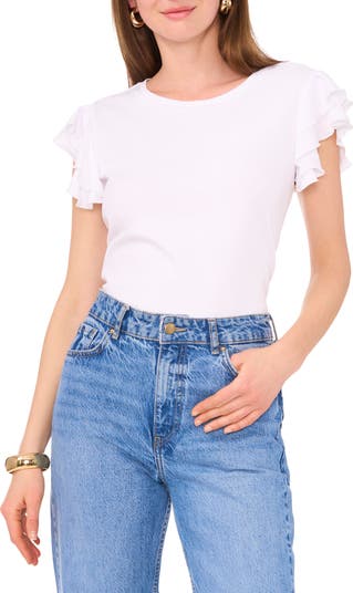 A soft, staple top, cut from a cool cotton blend, brings a just-right extra to the look with frothy woven ruffles framing the short sleeves.