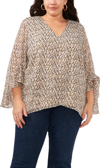 Fluttering ruffle sleeves frame this foil-print top designed with a high-low waist for added dimension.