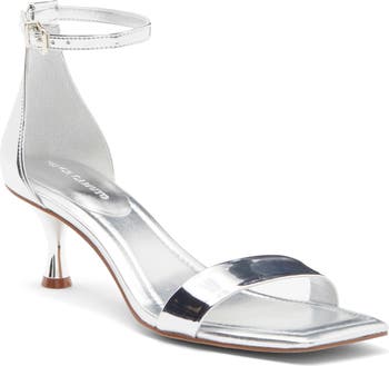 An angular square toe and kitten heel frame a sleek leather sandal secured by an adjustable strap at the ankle.