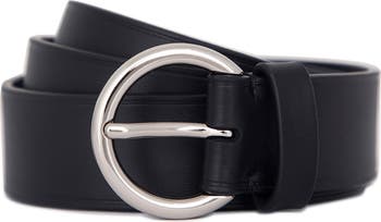 Smooth leather construction defines a belt fitted with a sleek buckle for a bit of shine.