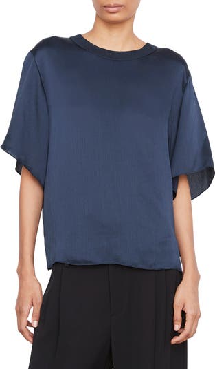 This flutter-sleeve blouse is crafted from luxe silk with a ribbed crewneck.