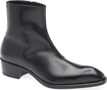 Smooth leather construction highlights the fashion house's impeccable craftsmanship in a streamlined ankle boot masterfully made in Italy.
