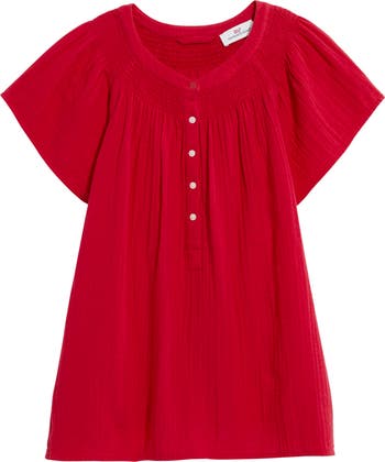 A relaxed flutter sleeve top crafted in breathable cotton gauze features a lightly smocked neckline with a partial button front to underscore the casual feel.