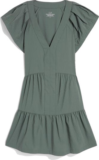 Fluttering sleeves frame this V-neck dress designed with flouncy tiered ruffles.