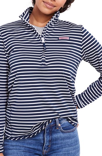A classic half-zip pullover steps it up a notch in a microstripe pattern and white flatlock seams that flaunt the comfort of this stretchy style.