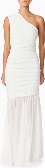 Grace your next event in this gauzy mesh one-shoulder gown showcasing an elegantly ruched body balanced by an ethereal trumpet hem.