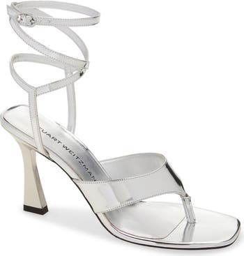 A center toe post and wraparound ankle strap offer a stylishly secure fit on a Spanish-made sandal featuring a lustrous metallic upper and sculptural flare heel.