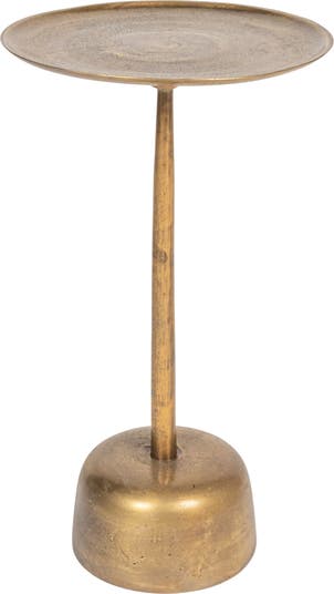 - A sleek and elegant side table that features a round aluminum top with a thin stem and an antique brass finish