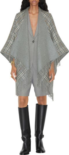 Warming merino wool in a luxurious double weave is fashioned into this perfectly fringed cape that can be worn with either the solid or check side out.