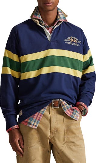 Archival logo embroidery elevates the look of this classic rugby shirt topped with a subtly distressed khaki collar.