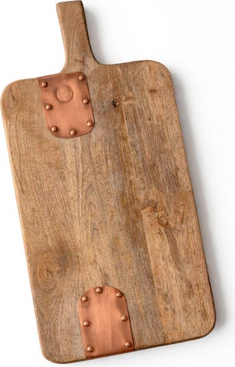 Inspired by a rare 19th-century dough board discovered by founder Beth Ann Luke in a French antique market, this vintage-inspired wooden board is a stunning blend of form and function. Handmade from solid wood and adorned with hand-cut, hand-forged copper straps secured by rolled copper rivets, this design took three years to bring to life. It serves beautifully as both a charcuterie board and a functional chopping board, making it a true heirloom-quality piece crafted for everyday use and elevated entertaining. Part of our signature European-style kitchen decor collection, this board pairs perfectly with our matching copper-accented serving bowl and utensils to complete the look. Whether you’re displaying artisan cheeses, preparing fresh herbs, or styling it upright as a beautiful backdrop—just as founder Beth Ann does in her own kitchen when it’s not in use—it brings old-world charm and craftsmanship into your home. Care: Wipe clean with a damp cloth and condition wood with food-safe oil as needed. Copper details will develop a natural patina over time, enhancing the vintage copper cookware aesthetic. Sold individually or as a complete heirloom set with our matching serving bowl and utensils.