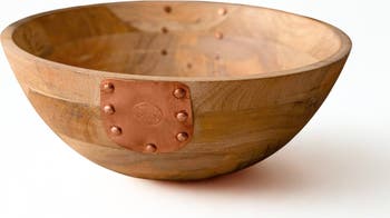 Crafted with heritage in mind, this vintage inspired wooden serving bowl brings timeless European charm to your table. Designed by founder Beth Ann after discovering a 19th-century dough board in France, this piece features two hand-forged copper straps secured with oversized copper rivets—blending old-world craftsmanship with heirloom-quality beauty. Three years in the making, this bowl is part of a matching set that includes our signature cutting boards and utensils, offering a cohesive and elevated way to entertain. At Coppermill Kitchen, we design vintage-inspired pieces that blend soul, story, and utility. This wood serving bowl is perfect for displaying fruits, serving fresh salads, or anchoring your charcuterie spread in style. Pair it with our matching board and utensils for a full presentation set that speaks to European-style kitchen decor. Sold individually or as a complete heirloom set with our matching cutting board and serving utensils. Dimensions: 12”Diameter