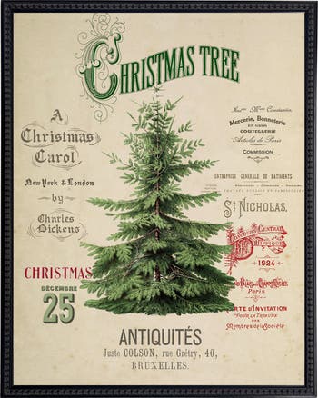 This vintage-inspired print, framed in a black-beaded wooden frame, features a painting of a Christmas tree on a distressed bookplate background. Sized at 19 inches by 25 inches, this made in the USA frame makes for a beautiful addition to any wall. Made in USA Made with real wood Hangs from back-mounted hardware Encased in glass