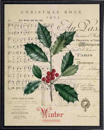 This vintage-inspired print, framed in a black-beaded wooden frame, features a painting of holly on a distressed bookplate background. Sized at 19 inches by 25 inches, this made in the USA frame makes for a beautiful addition to any wall. Made in USA Made with real wood Hangs from back-mounted hardware Encased in glass