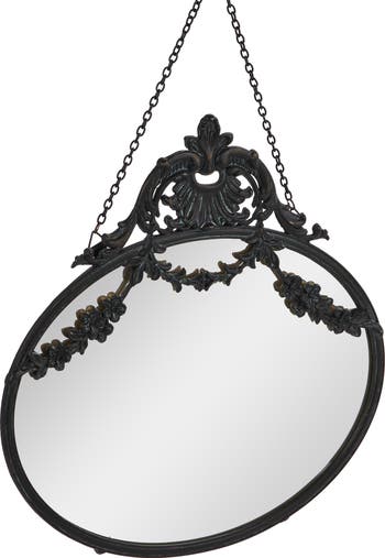 - This statement-making wall mirror showcases a dramatic, black pewter frame and decorative chain