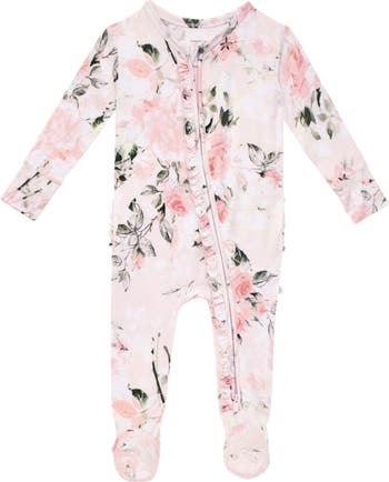 Baby will look especially sweet in a ruffly footie patterned in vintage-look roses with grippy soles for stability.