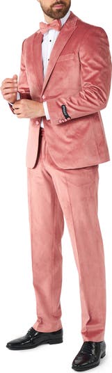 Dusty-pink velvet brings polish and shimmer to a tuxedo that's styled for making entrances with satin-wrapped buttons and a matching velvet bow tie. Besom pockets on the jacket and flat-front trousers keep the look streamlined, smart and all-occasion elegant. When the party's over, it washes easily in your machine so it's always ready for your next festive event.