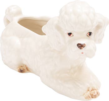 - A charming poodle-shaped stoneware planter with hand-painted white, brown, and black detailing for whimsical appeal