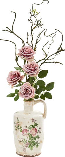 Year-round beauty springs to life from this artificial arrangement of vintage roses. Beautifully contained in a complementary floral-designed pitcher, this 29” tall arrangement boasts intricately designed flowers captured mid bloom, expertly set against dark green foliage. A chic addition to French country decor, this elegant arrangement will magically attract the eye.