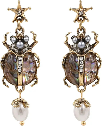 A symbol of renewal, protection, and timeless beauty. Inspired by ancient iconography, the Vintage Scarab Pearl Earrings honor transformation and resilience. Each piece features a luminous beetle form adorned with crystal rhinestones, a softly iridescent abalone shell body, and a suspended pearl drop—creating gentle movement and quiet drama with every wear.