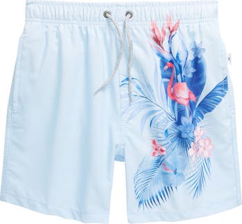A vibrant print enlivens these kid-size swim trunks made of quick-drying four-way-stretch fabric that stays comfortable in the water and on land.